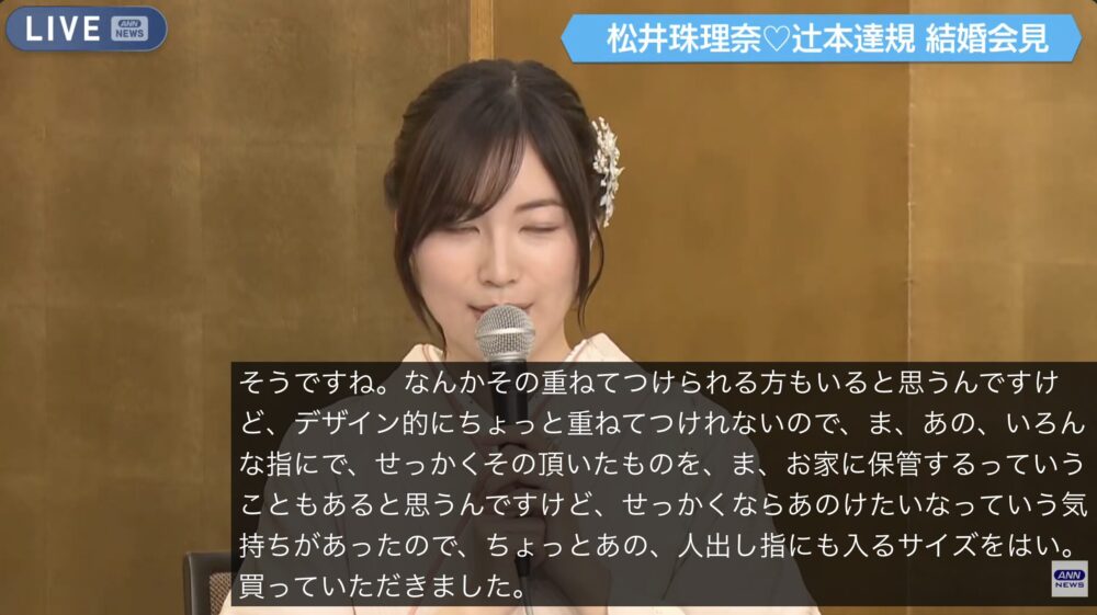 松井珠理奈さんと辻本達規さんの結婚会見で注目されたのが、松井さんの左手に着けられていた指輪です。