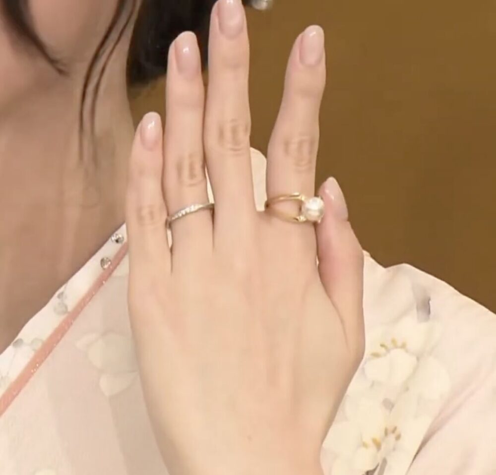 薬指は結婚指輪、人差し指は大粒パールの婚約指輪と報じられ、婚約指輪はミキモトの真珠を選んだという話も出ています。